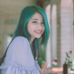 Beautiful young woman with vibrant green hair smiling happily indoors.